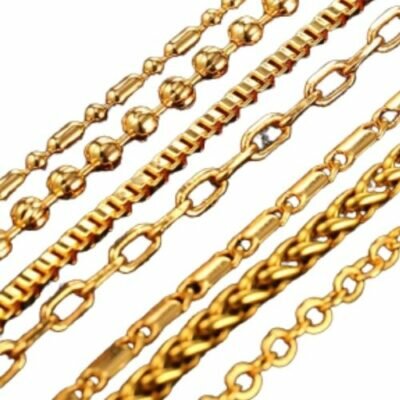 El chapado en oro puede aplicarse a la mayoría de los metales, como el níquel, el latón, el acero inoxidable, la plata y el cobre. De ellos, la plata y el cobre son los más utilizados. La fina capa de oro da a la cadena un aspecto brillante y dorado