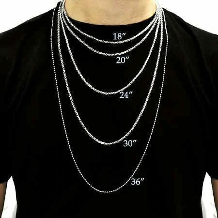La cadena de 20” es el largo de cadena más común para la mayoría de los hombres, ya que es el largo de cadena correcto, con la cadena cayendo directamente sobre la clavícula y entre el primer y segundo botón para las camisas con botones.